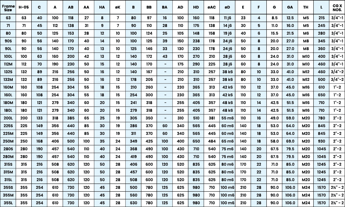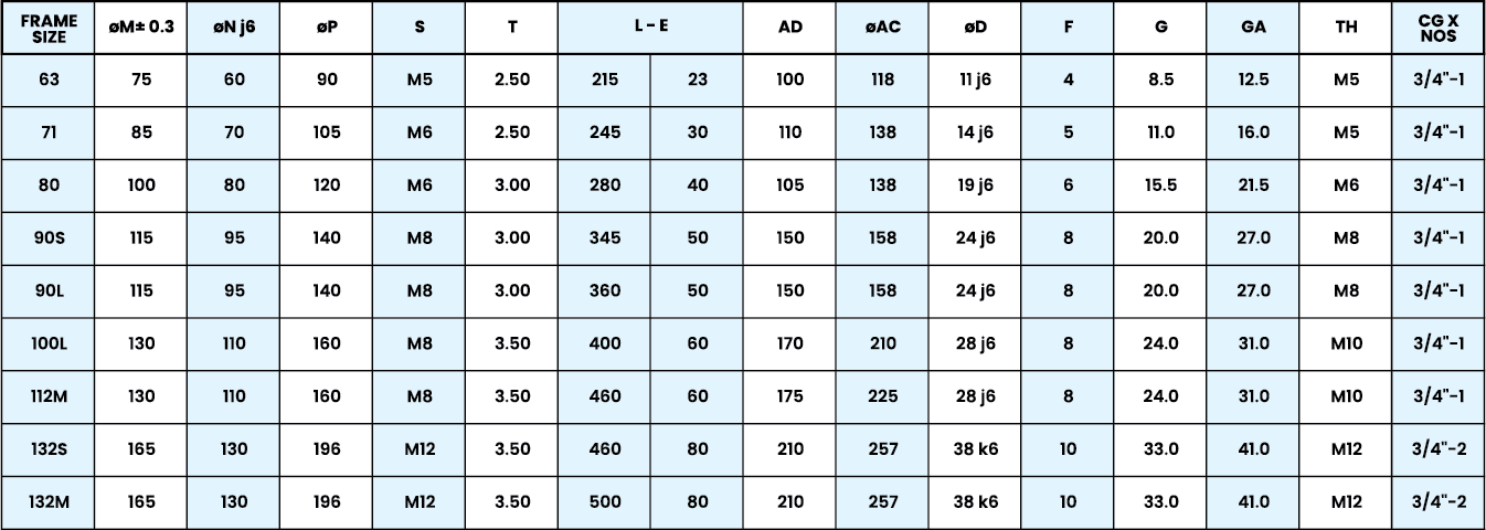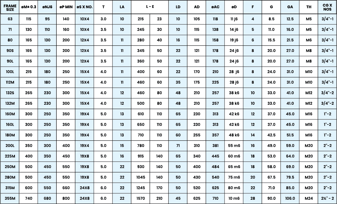 - Construction: B3 (Foot Mounting), B5 (Flange Mounting), B14 (Face Mounting), B35(Foot cum Flange Mounting)